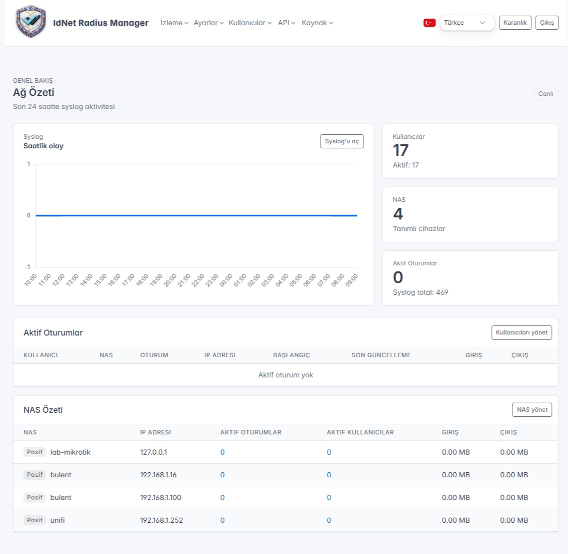 API_PORT (varsayılan 3000)RADIUS_AUTH_PORT (varsayılan 1812)RADIUS_ACCT_PORT (varsayılan 1813)SYSLOG_PORT (varsayılan UDP 514)RADIUS_COA_PORT (varsayılan 3799)/radius incoming set accept=yes önerilir.IDNET Radius Manager, farklı altyapılara kolayca uyum sağlayacak şekilde tasarlanmıştır ve Windows, Linux ve Docker ortamlarında çalıştırılabilir.